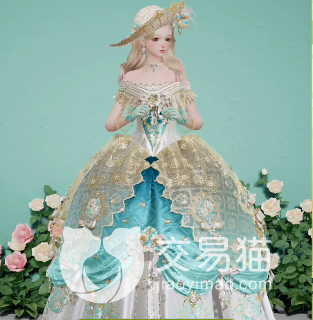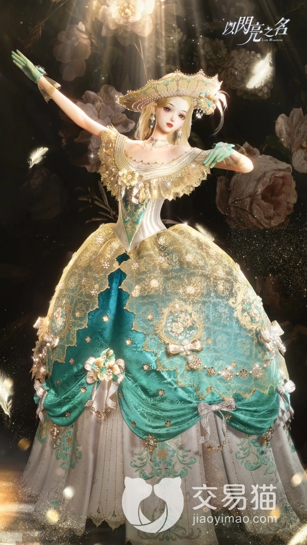 这款套装之所有散发着华贵气息很大程度来源于它的设计,紧身束腰款与充满欧洲风情超大裙摆完美结合,裙摆处裙身上的刺绣蕾丝蝴蝶结配以珠宝点缀,在富丽堂皇的金色色调衬托下, 显得明艳又庄重,散发一股贵族气。