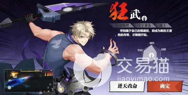 狂武:该职业的外观是一个非常强壮的白发少年,他是游戏中的战士,擅长与敌人进行近战攻击,能对敌人造成超高的物理伤害,并且自身的生存能力和操控能力都非常的强,机动性也比较不错,在战斗中主要是使用他的武器巨刃来对敌人造成伤害,他的控场能力也比较不错,可以短时间内控制住敌人,然后再对其进行高额输出。他的绝技巨剑风暴能直接使用武器旋转,对敌人造成543%的攻击伤害和364%的物理伤害,最后一击还能直接将敌人击飞,并造成292%的攻击伤害,195%的物理伤害。