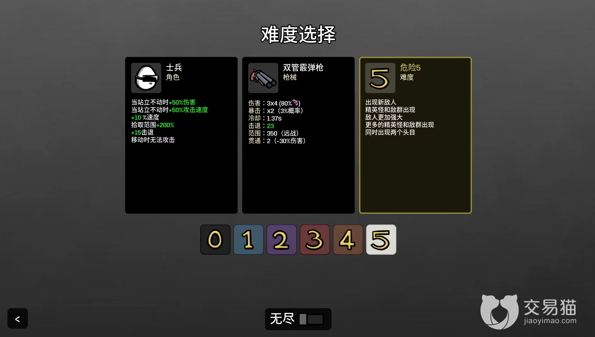3、小编思前想后最后使用的是属性流,前期选择电击枪加电刀,在刷到喷火之后就换上,这样在后期清零精英怪物的时候就方便多了。在游戏的前期阶段武器和收获是需要主要获取的。续航的话就是依靠吸血了。护甲和闪这两个属性,大家根据自己的习惯进行抉择。小编个人的话会更加倾向于防御,这样就能舍弃全部的闪避和暴击来换取更高面板属性。之后就是非常重要的“移速”属性了,这个属性是一定不能少的,不然后期基本就是个活靶子。