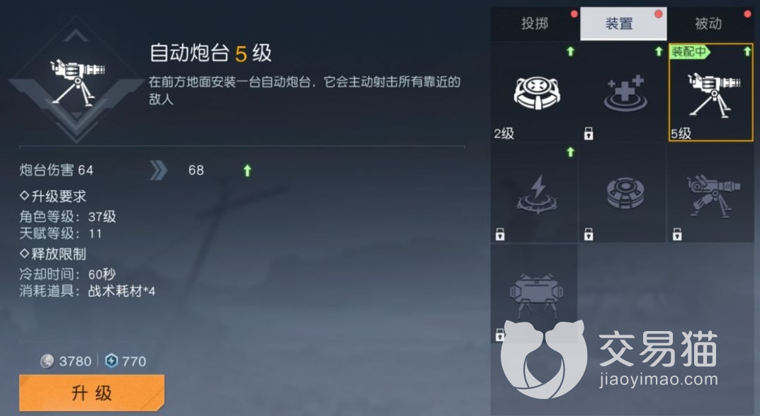 在使用之前首先要先了解该装备主要特点,玩家可以在装置类技能中直接找到,但是初期并不能直接使用,需要先提升天赋等级,当达到5级时就能解锁。该技能效果非常简单,只要选中地方之后,直接使用就能放置起机枪炮塔。和名字一样,攻击可以自动进行无需手动操作,当周围出现敌人时会自动锁定并且攻击,旋转起来没有任何死角,周围360度范围都能攻击到。缺点是虽然属于远距离攻击手段,但是射程并不算太远,所以比较讲究释放位置。