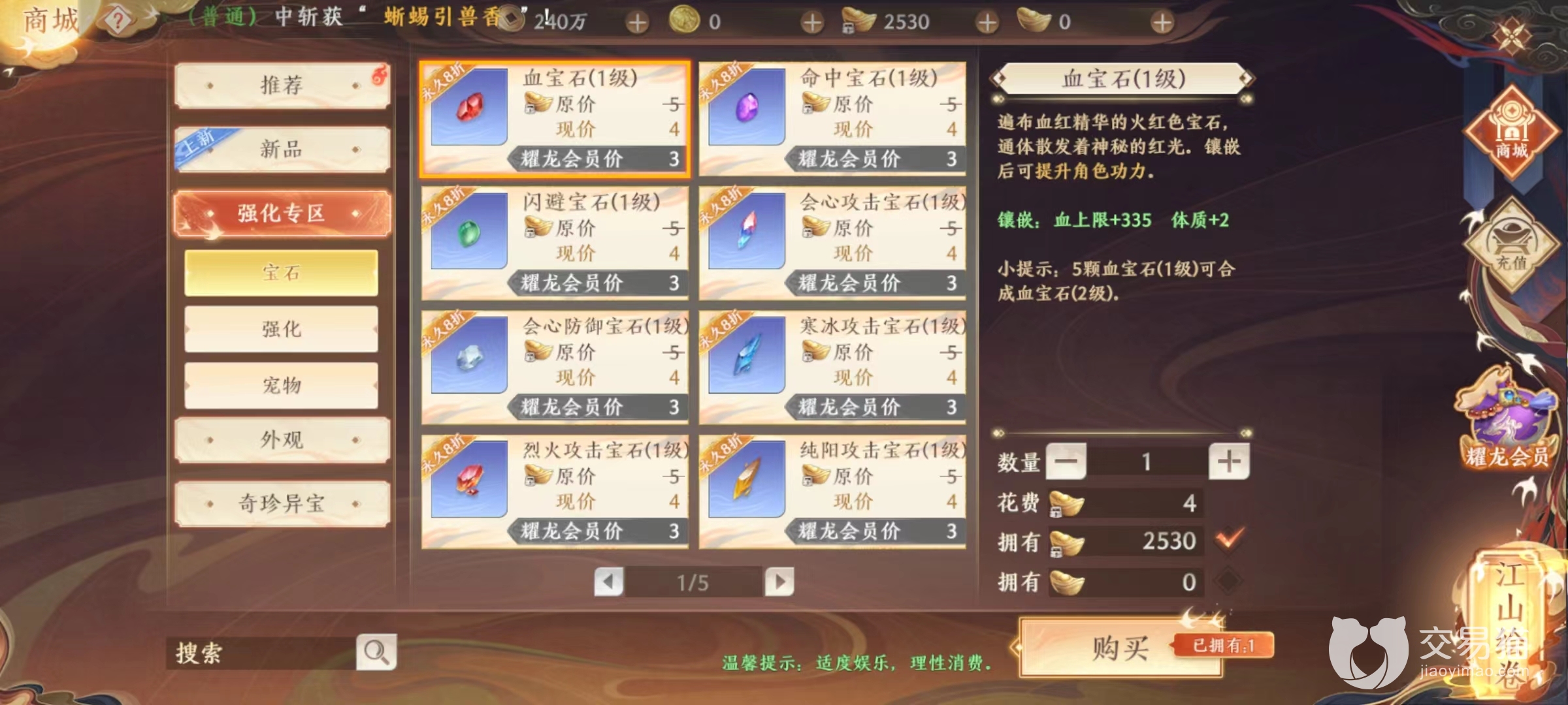 接下来装备前期以门派套装为主,后期通过各种刷副本再逐渐更换,宝石反倒是对战力影响很关键的地方,镶嵌时候一定要掌握技巧。优先将低级宝石平均镶嵌到不同装备上,一定要做到每个镶嵌孔中都有宝石。这样后期在获取更多之后逐个提升,不仅收益最高,还有额外属性加成。这些方面全部做到位之后,接下来只需要每天将日常活动刷一遍,尽量选择实力比较强的队友去打挑战副本。