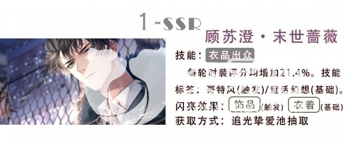 顾苏澄是一个男神角色,可以攻略他,帮助玩家们获取更多的分数加成,有三种品质,分别是ssr、sr以及r级,这三个品质实力是从高到低排序的,我们可以通过培养卡牌来提升战力。