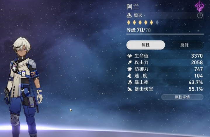 输出主力的话,推荐选择阿兰。这个角色的属性值和技能都是非常不错的,而且他的实力主要都在于自身,不会太过依赖于光锥等其他外界的加成因素,因此培养难度相对来说没有那么高,尤其适合那些不想充钱,资源又非常贫瘠的玩家们。