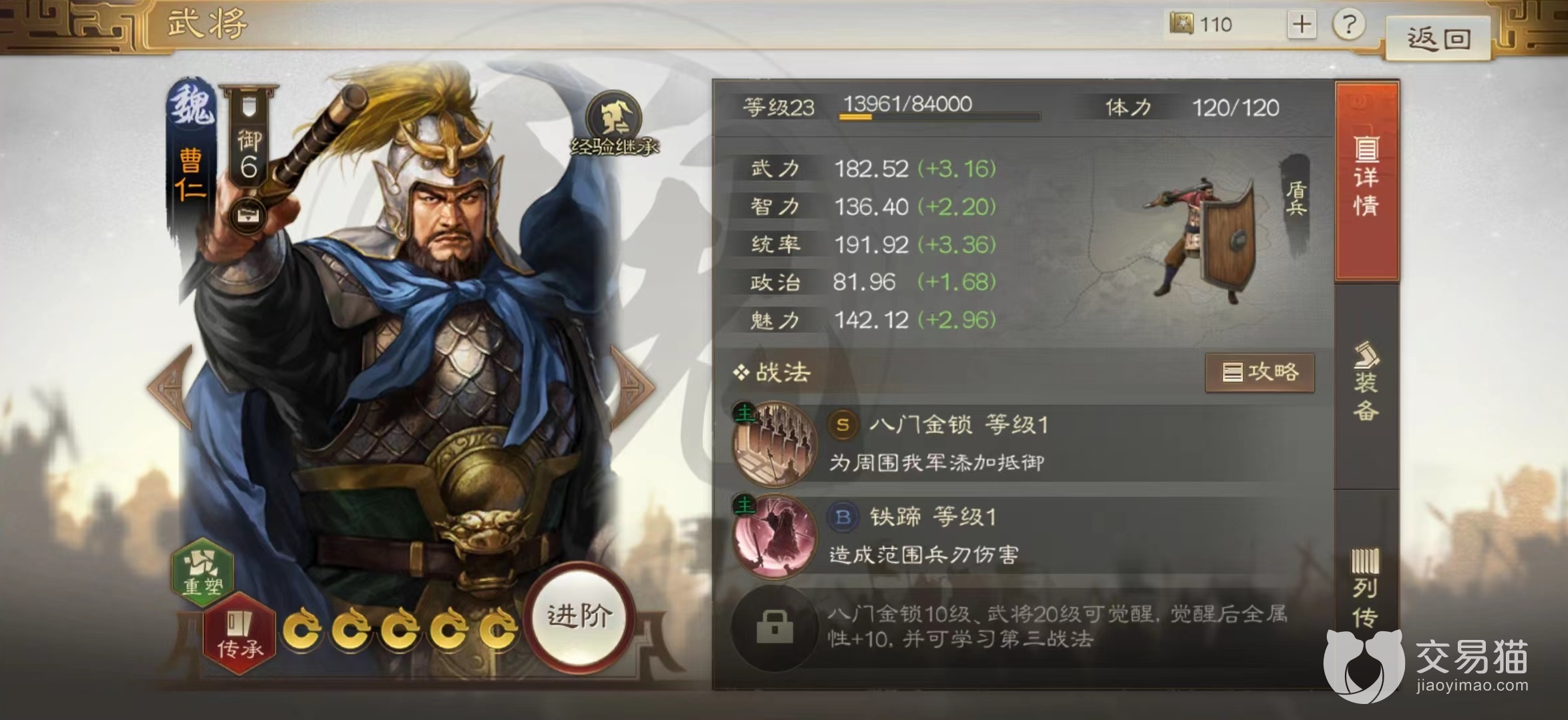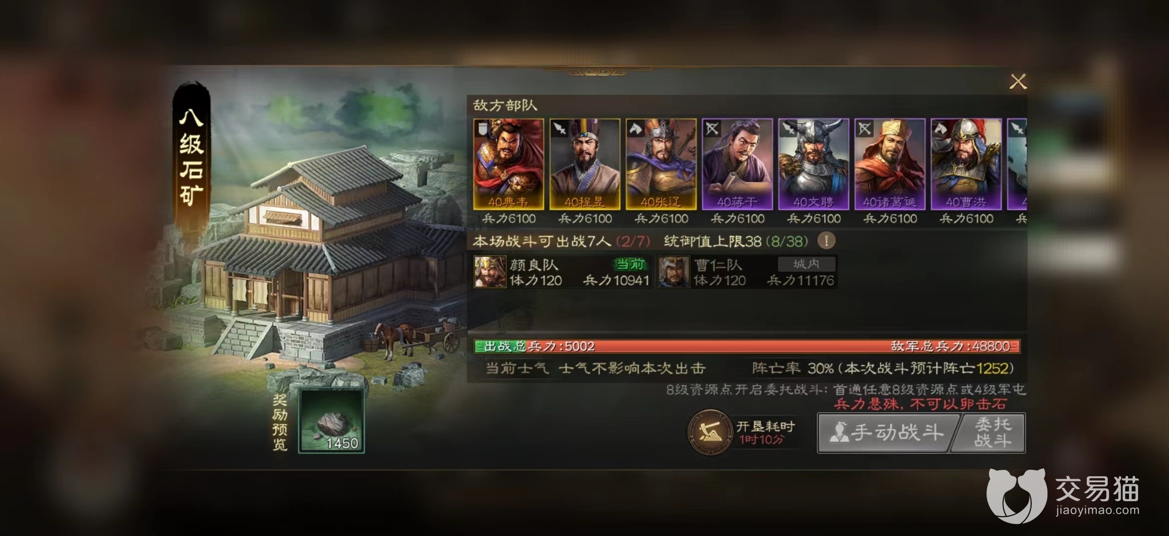 防守八级土地上的敌方武将带兵数量已经达到了6100,这样七名武将计算下来总计有将近五万兵力,所以玩家面临的压力将是空前的。这样在阵容上必须具备以下几项硬性条件,那就是所有上阵武将等级都要大于35级,自带战法全部升满,其他学习的战法也尽量升到顶级。每个武将带兵数量不能少于4000,而且尽量选择第六和第7名武将上阵参战,这样才能应对敌方带来的压力。