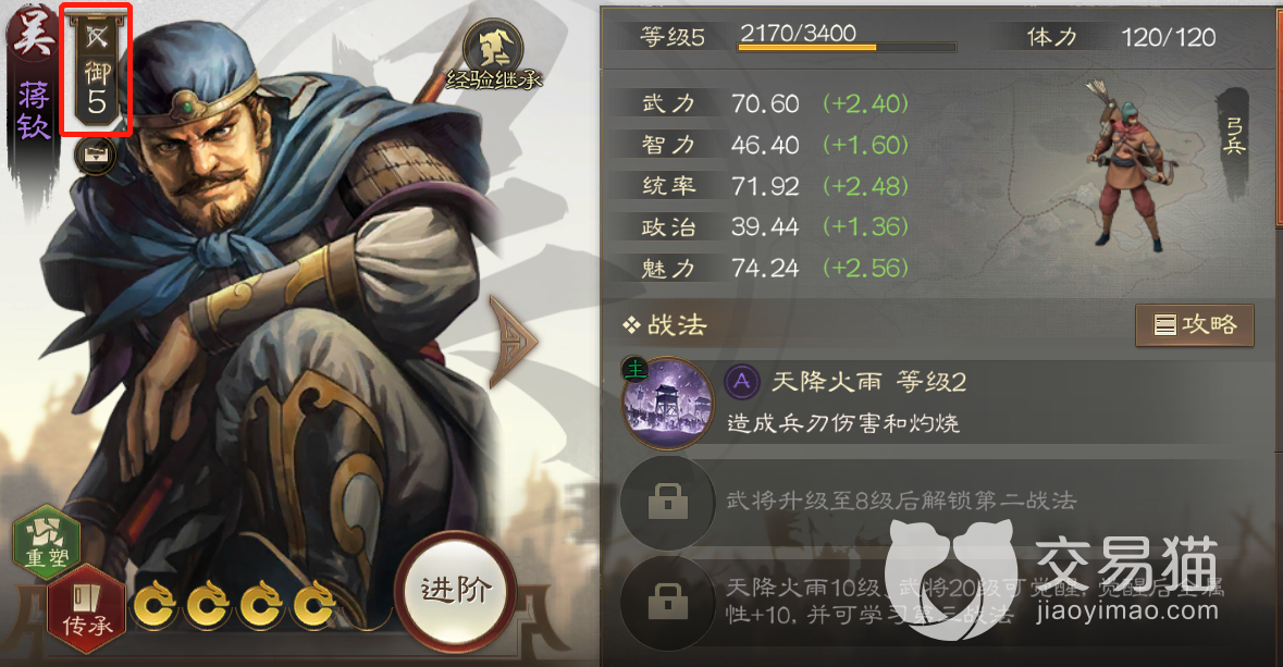 统御值有两种,一个是武将个人的统御值,这个可以直接在武将面板的左上角查看,目前最高为7点,最低为3点,通常来说,此项数值越高的武将他的属性和战法就会更为强力。