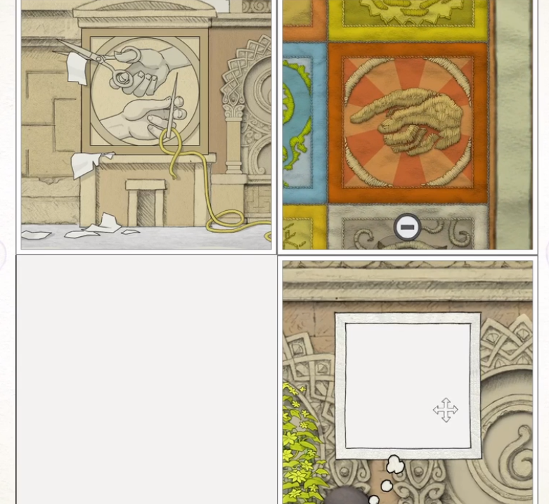 第2格往下点击缩小,玩家可以看到一道小门,第1与第2格互相交换位置,点击主角的剪刀框,并且脱下框。在一堆剪报中选择左下方的黑白左手手势,重新把框贴上,领导主角往左走,进入小门。