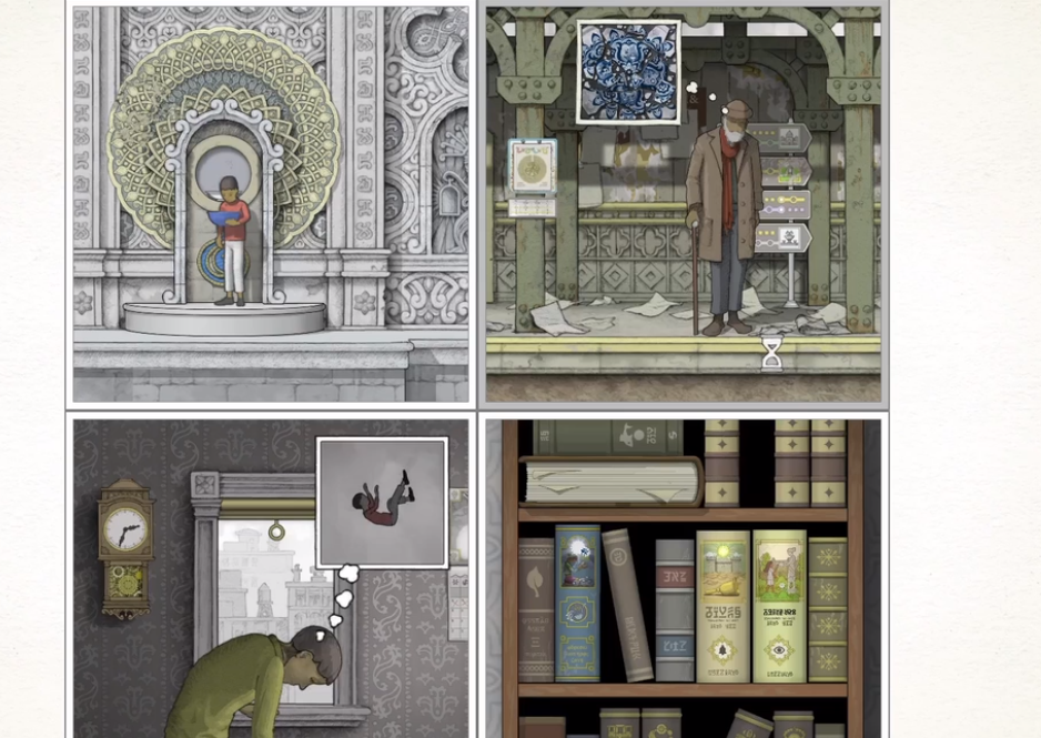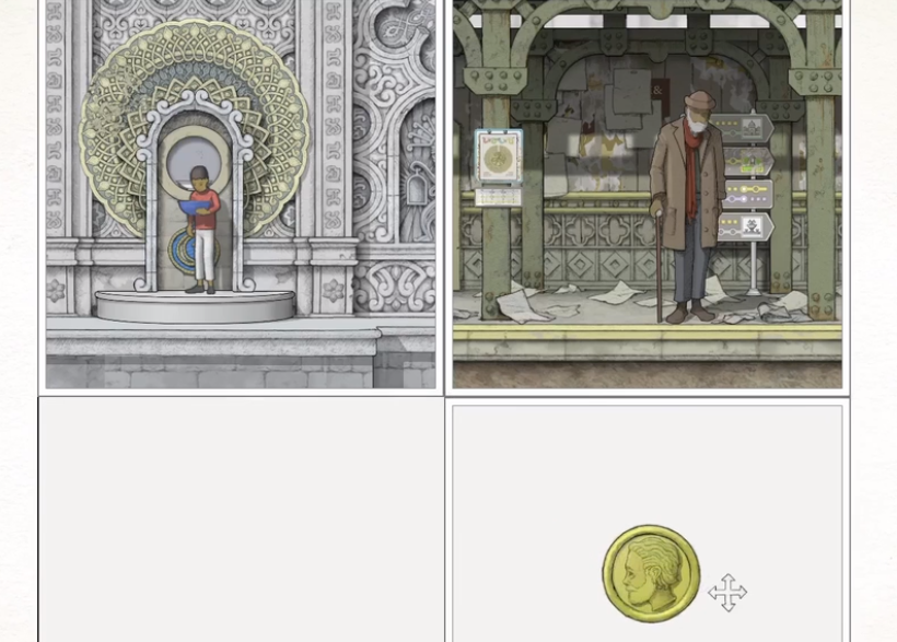 接着,在第2张图点击往左移动开启一个空门,将第1张图片主角的门移动覆盖到第2张图上,引导年幼时期主角来到巴士站。点击巴士站的站牌,里面有一个紫色的塔楼,将塔楼的外框移动到第1个格子,然后缩小第1个与第2个格子。