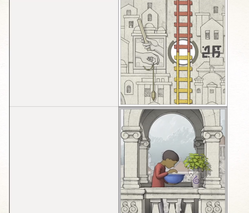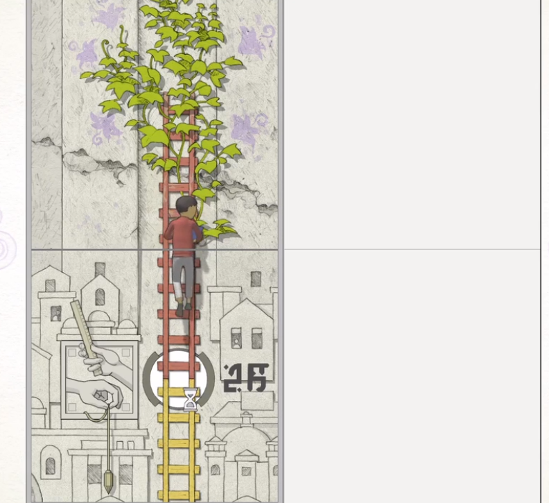 缩小第1张图片,然后点击最右边的黄色楼梯,放大后拼接到第四格与爬楼梯的主角相连接,主角往下爬之后发现身形会变大,可以进入教堂。主角进入教堂之后会自动往塔楼上走,摘到瓶子里的紫色果实,并放入盆子里面,到此紫色章节关卡就结束了。