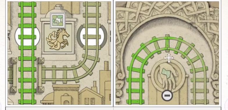 此时,第1个格子的巴士到站了,点击巴士投币框,将第3个格子的硬币投进去,让主角搭上巴士。主角乘上车之后点击巴士站的路线图修改路线,先点击第2张图进入杂草丛生的教堂,选择第1个门,放大看到有半条绿色轨道图,与第1张图的绿色轨道拼接,引导列车走入绿色铁道,然后就能顺利到达最后紫色的铁道,主角进入紫色塔楼外围。