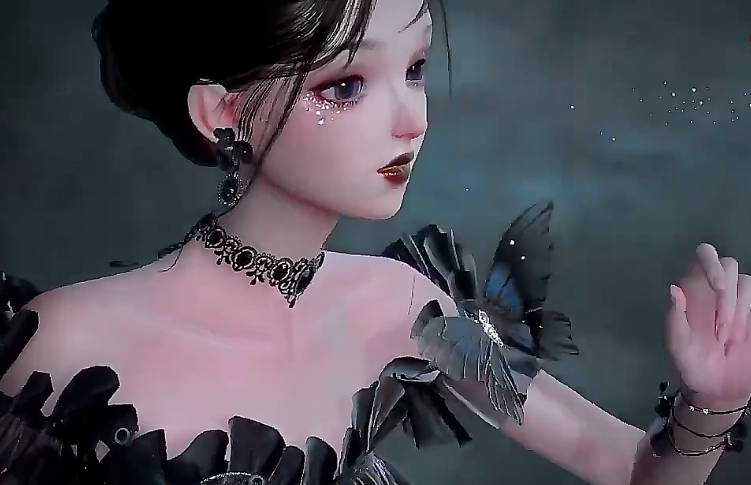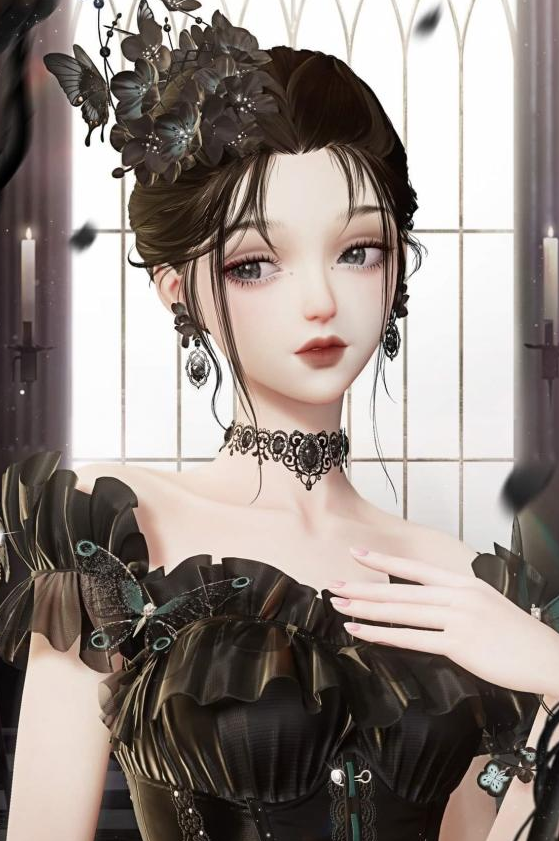 这个套装整体的感觉就是暗黑系通话,我们可以看到很多黑暗的童话风元素,蝴蝶的点缀也让这套服装多了意思神秘感,衣摆也是优雅的蕾丝,镶嵌更多的钻石,美丽而高贵。
