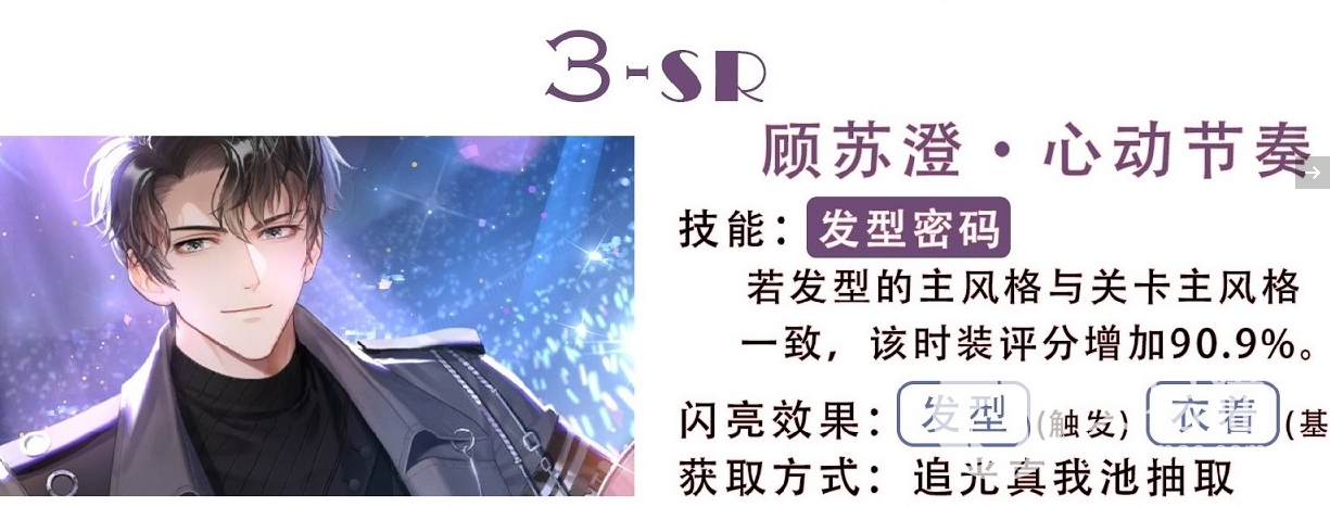心动节奏是一个SR级卡牌,它的技能为发型密码,这个卡牌在游戏内可是非常强势的,玩家们如果使用的发型与游戏主关卡要求的发型保持一致的话,那么我们这个发型的得分就将大幅度提升。而且后续还能解锁更多额外的闪亮效果,让玩家们可以变得更加绚丽多彩。