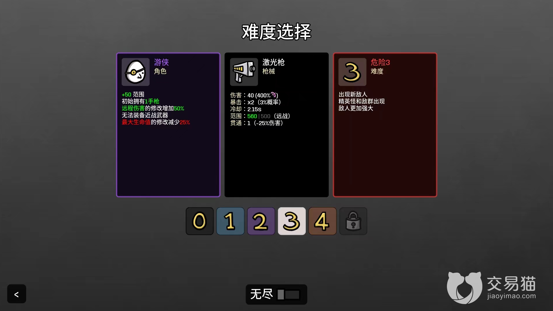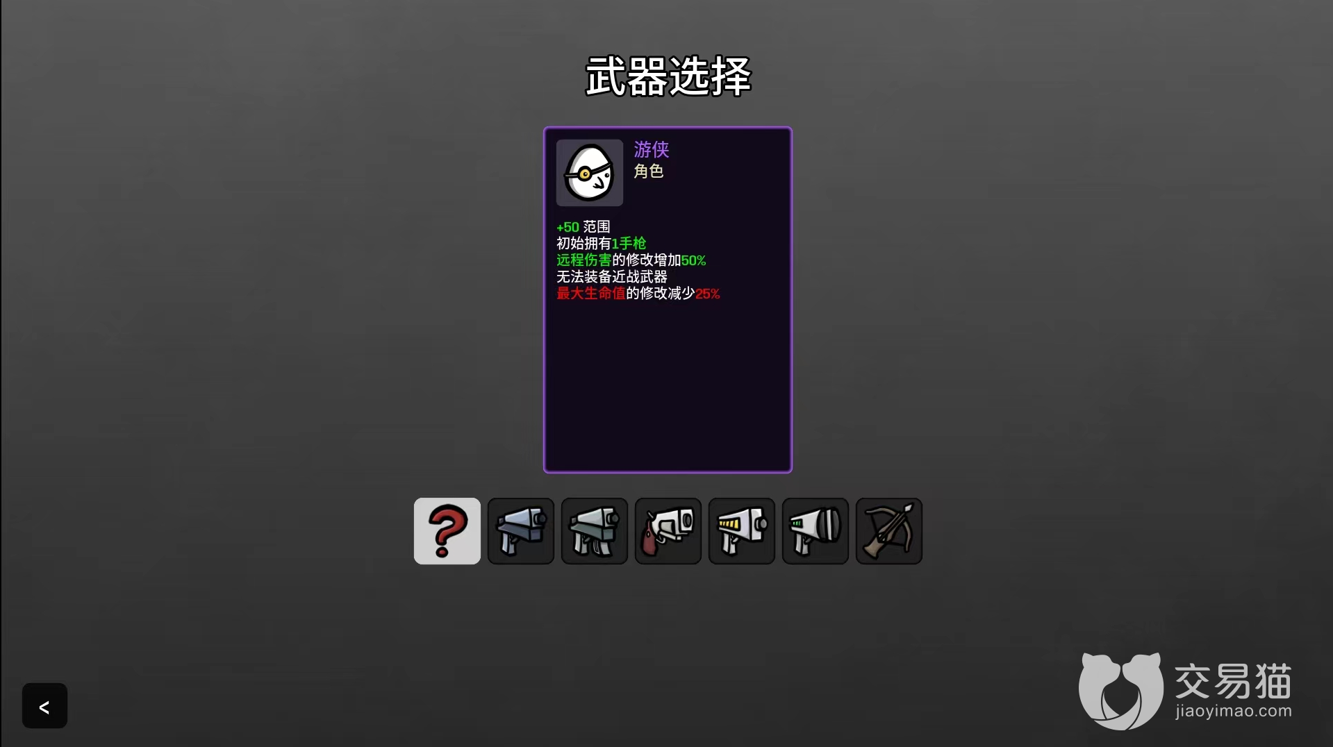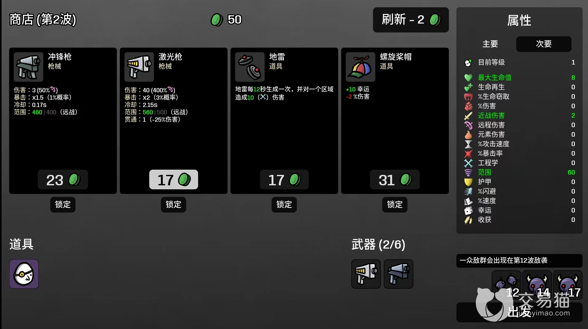 4、游侠:游侠的话一般来说肯定就是玩冲锋枪了,然后开局给的这个手枪可以直接第一波就给卖掉,让商店里面多刷一些冲锋枪出来。因为手上拿的武器,是会影响商店里面给你的武器的。