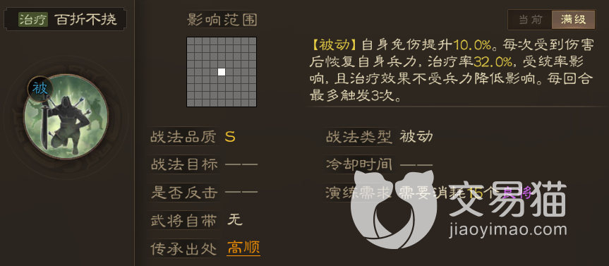 百折不挠:这是一个被动战法,对于身为枪兵的陆逊来说,冲在前排肯定会吃很多伤害,因此这个能够反复提供兵力回复的战法就派上用场了,每次受到伤害都能回复兵力,而且治疗率也不错,恰好它还受到陆逊比较见长的统率属性增益,能够发挥极强的续航保障。