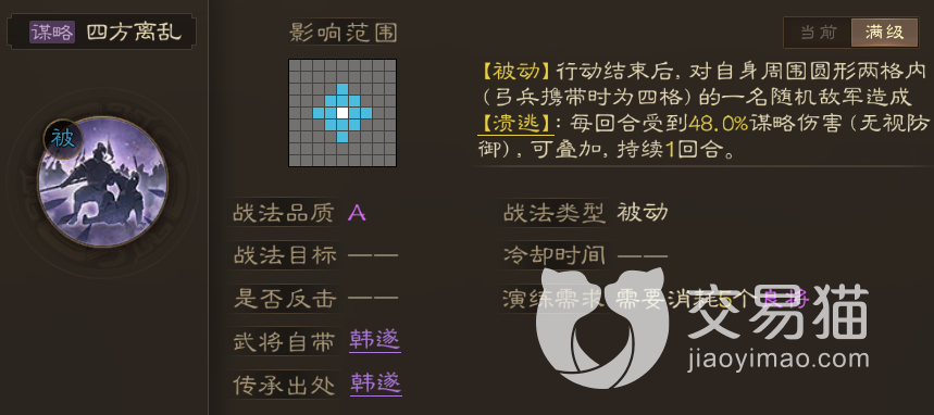 四方离乱:这一战法会在行动结束后对敌人施加溃逃效果,虽然每回合施加的伤害不高,但因为本身属于可受智力加成的谋略伤害,而且还能无视防御,所以配合陆逊的高属性面板以及自带战法的灼烧伤害仍然能打出漂亮的输出。