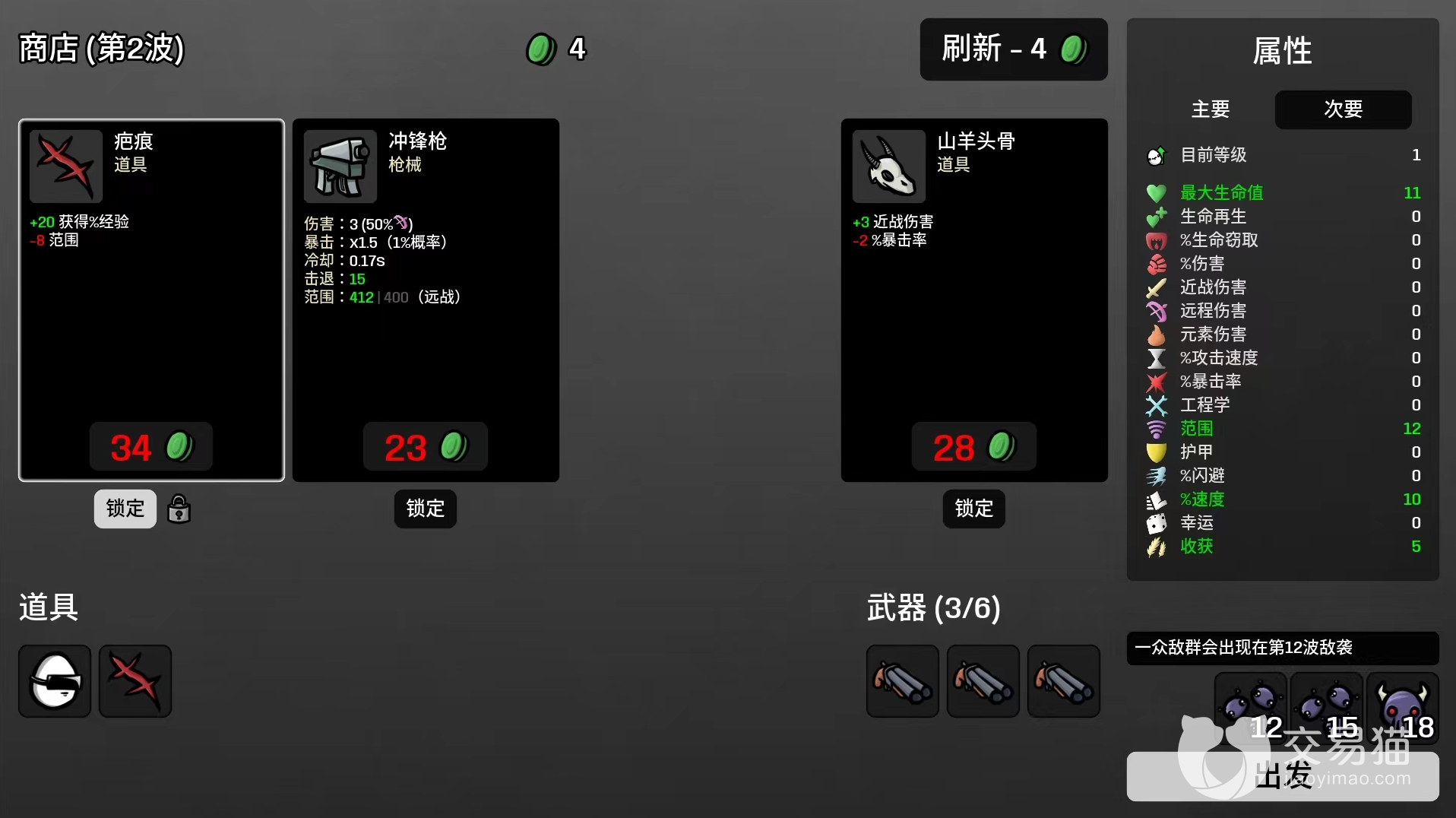 2、在游戏刚开局的时候最重要的属性就非“收获”莫属了,开局的前几波基本都是全拿收获的。因为开局东西的价格比较低,因此收获的性价比是最高的。到了后期由于刷经验和前的速度上来了,再加上商店道具价格变贵等原因,在选择收获之前要考虑好是否能够赚回本金来。