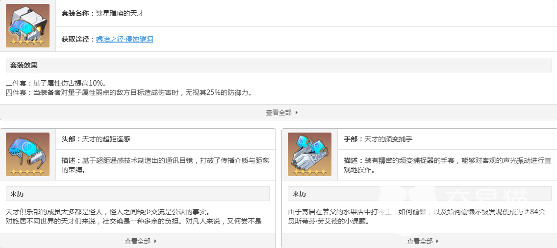 虽然理论上四件套的输出为最高,但如果前期不能收集完毕,在只有两件套情况下也能达到很好的输出提升。但是后期一定要不惜代价补齐,毕竟能够穿戴该遗器的角色都是当前输出很强势人选,将他们战力强化起来要比投入到其他角色上收益高的多。