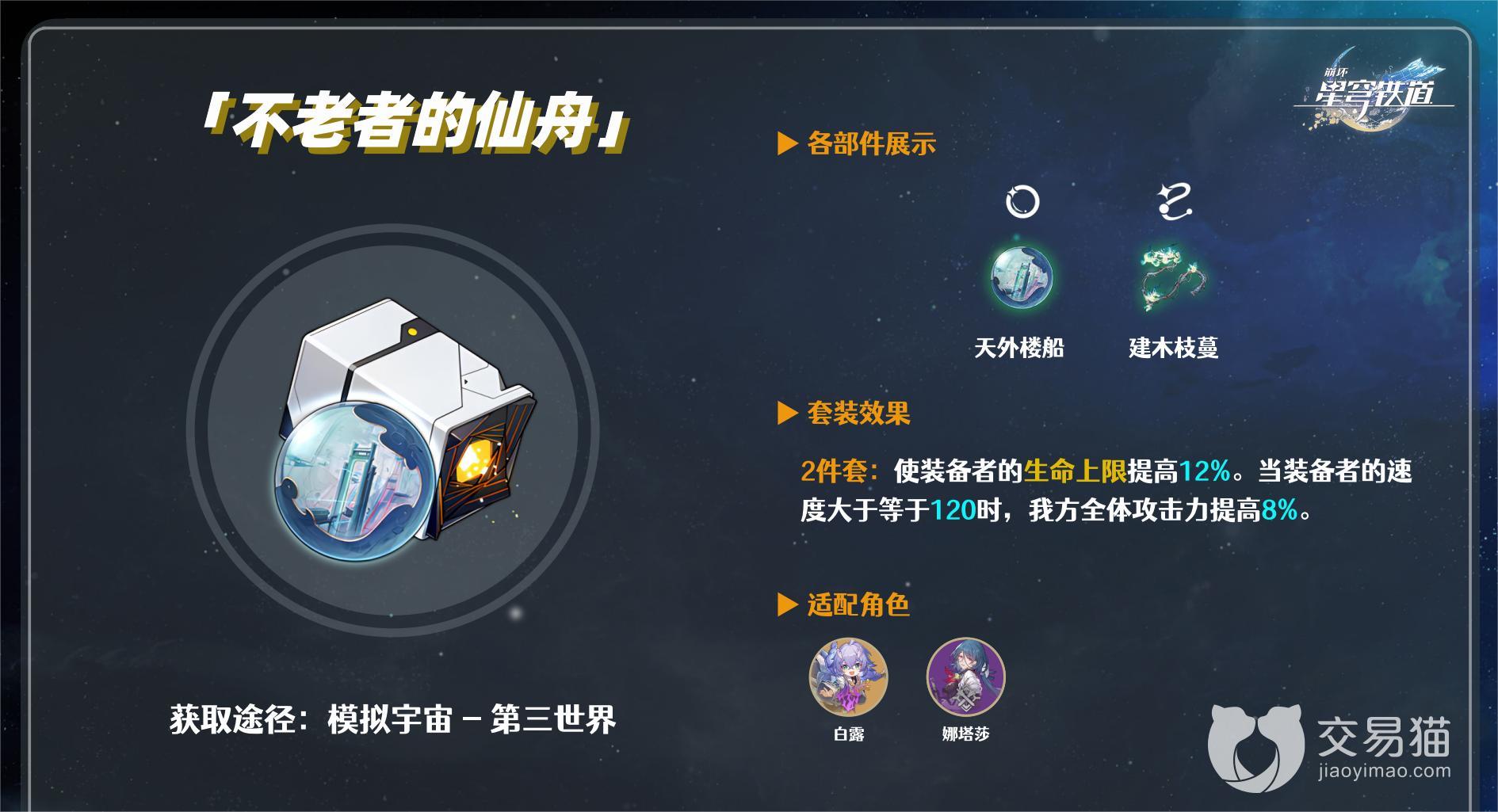 崩坏星穹铁道不老者的仙舟圣遗物套件可以通过第三世界模拟宇宙战斗中获取,质量从三星到五星不等,可以使装备者的生命上限提高12%,当装备者的速度大于120的时候,本方全体攻击力提高8%。是一套十分适合辅助使用的圣遗物。