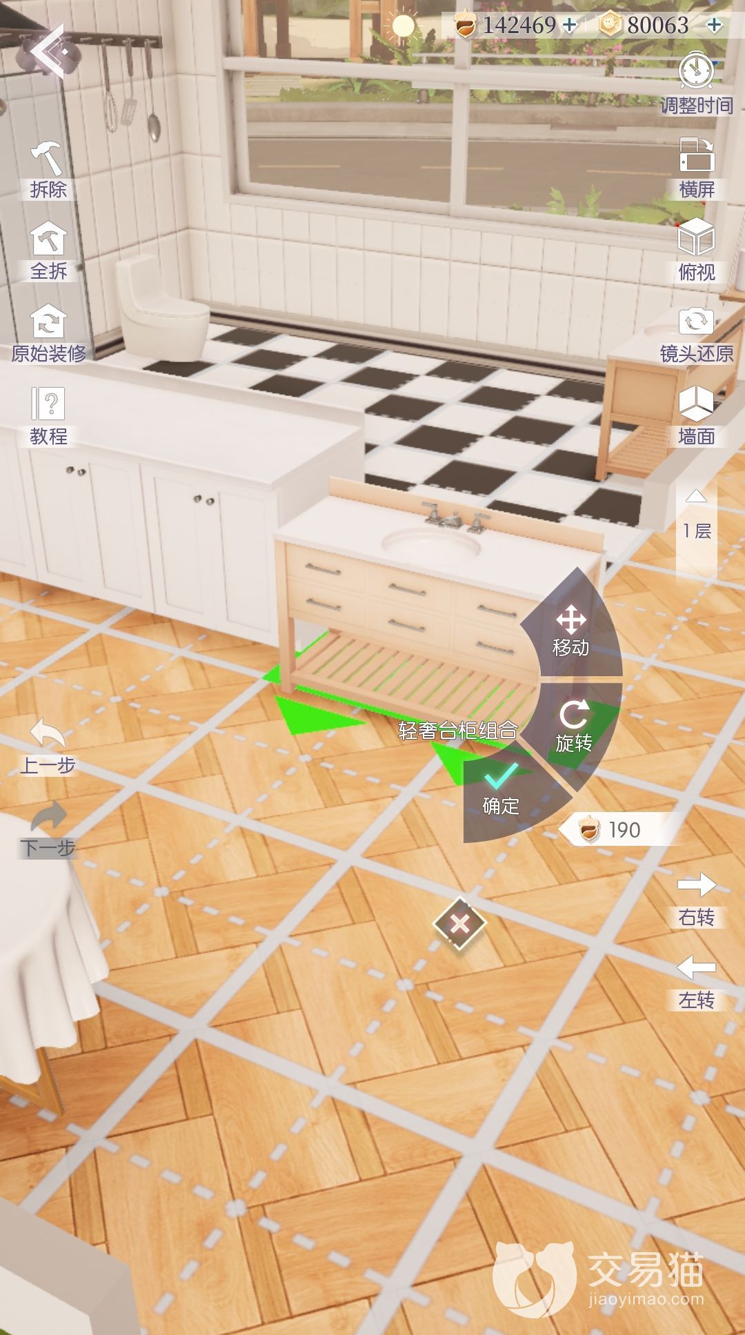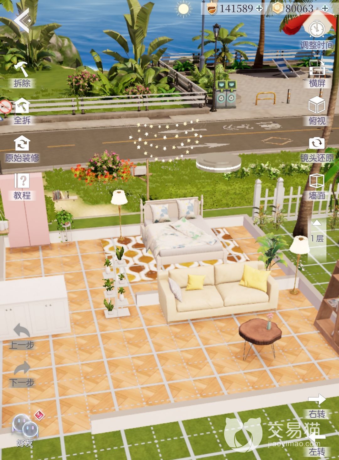 然后我们来到左上边的界面,点击“拆除”“全拆”或者“原始装修”来改造自己的房子,并在以上选择内购买家具等进行布置,如果觉得视角不方便,还可以在屏幕右边改成横屏或者调整视角个镜头,甚至还可以选择俯视或者隐藏一定的墙面。