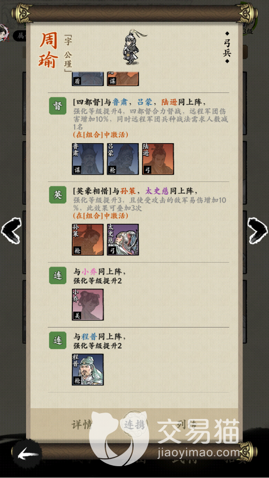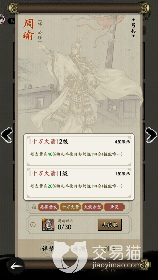 四技能业炎使用的时候也是需要对面在灼烧状态里面的,这样会有额外的伤害,伤害值是智力乘以30%,倍率很高,周瑜的弓兵天赋一个是乱射一个是箭雨,需要三个弓兵或者是六个弓兵上场才会触发,可以跟黄盖、诸葛亮一起产生赤壁之战的效果,跟鲁肃、吕蒙、陆逊一起产生四都督的效果们还有孙策、太史慈可以产生英豪相惜的效果,最后可以跟小乔、程普一起上场有强化的效果。