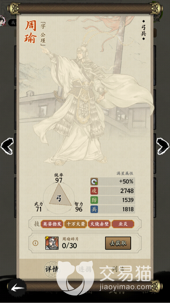 其实周瑜算是弓兵里面比较均衡的武将,品质是绝世的武将一般没有很差的,周瑜的统率有97,智力有96但是在这样的情况下连武力也有71,就算是一个短板不明显的角色了,一技能是英姿勃发,释放的时候每一只箭都可以对敌人造成基础伤害的同时还有额外的6%伤害。