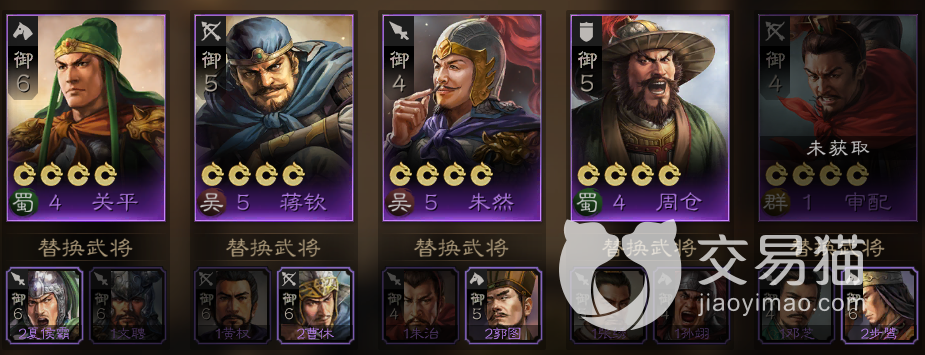 比较推荐的是下面这套以关平,蒋钦和朱然为核心的阵容,这一套虽然战力肯定比不过橙卡,但也能够在最大程度上恶心一手敌人,关平可以利用战法溅射后排,压低敌人C位的血线,朱然配合蒋钦的火烧不仅能打群体伤害,还能降低敌军智力,而周仓的震慑和审配的回复则保障了己方能够顺利施放战法而不至于被秒。