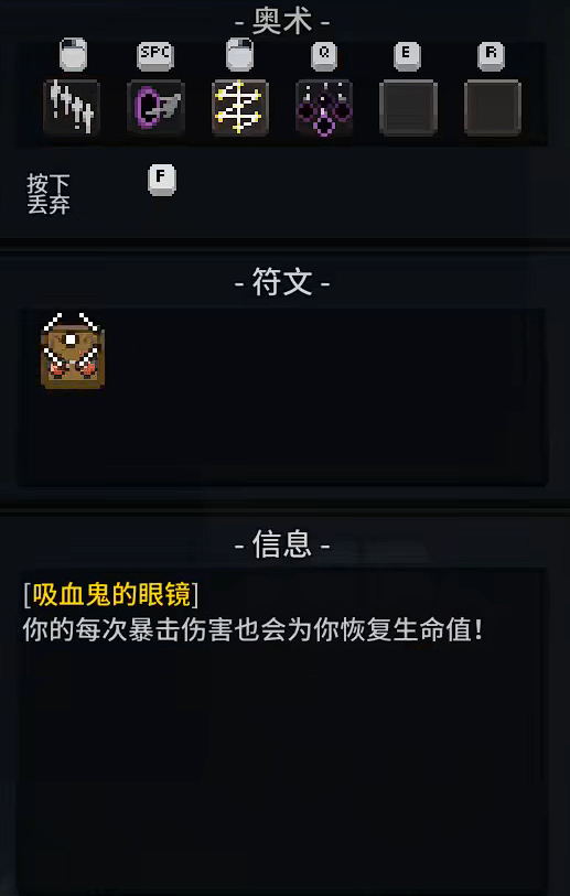 吸血鬼的眼镜,前面提到的非常不错的强势符文,能给予玩家们大量的吸血效果,是的,玩家们每一次暴击都会为玩家们恢复生命值,极大的减少了玩家们对于血瓶的依赖,能在前期发挥出非常不错的作用。