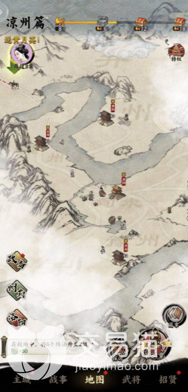 首先是大地图方面在这里可以看到玩家需要攻略的主要地点,古代三国的著名势力范围大家之后都会遇到,在这里会有很多的进度显示,并且一张地图全部完成了之后大家还能难道上面的进度箱子奖励,领取之后大家能获得很多的资源,用来抽卡非常的不错。