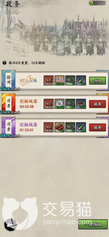 然后就是地图的任务选项,显示为政务系统,在这里玩家按照上面的要求可以完成各种任务,然后就能领取显示的各种奖励,每天都会刷新不同的奖励,大家记得一定也要完成,对于玩家的进度来说影响非常的大。