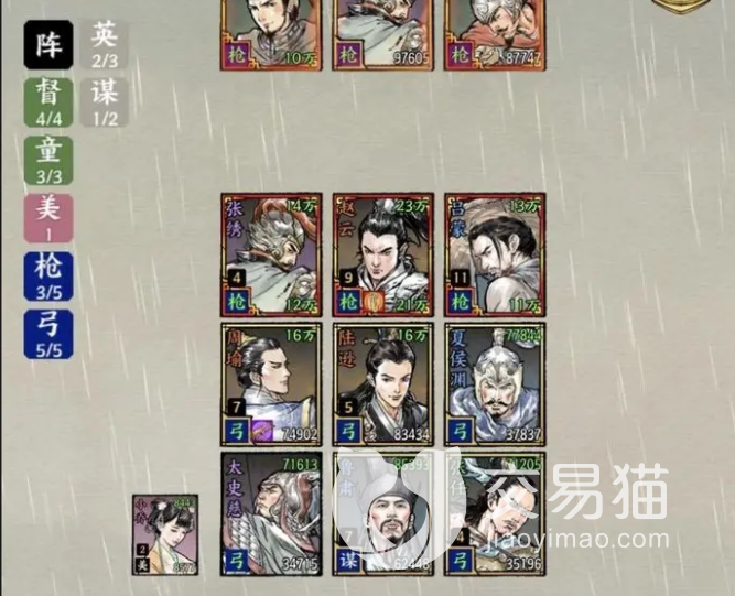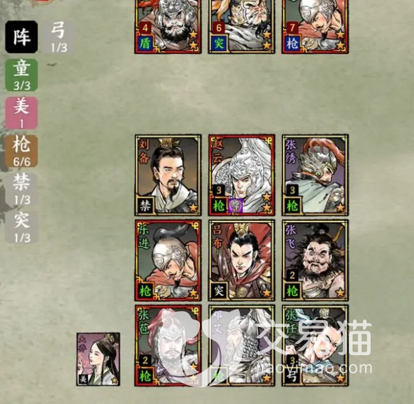可以构成的三枪的角色非常的多比如张绣还有吕蒙,这几个都是比较好搞的角色,但是后期不利于转成巅峰的五虎阵容,如果这有这些角色没有办法的话用起来还是可以的。