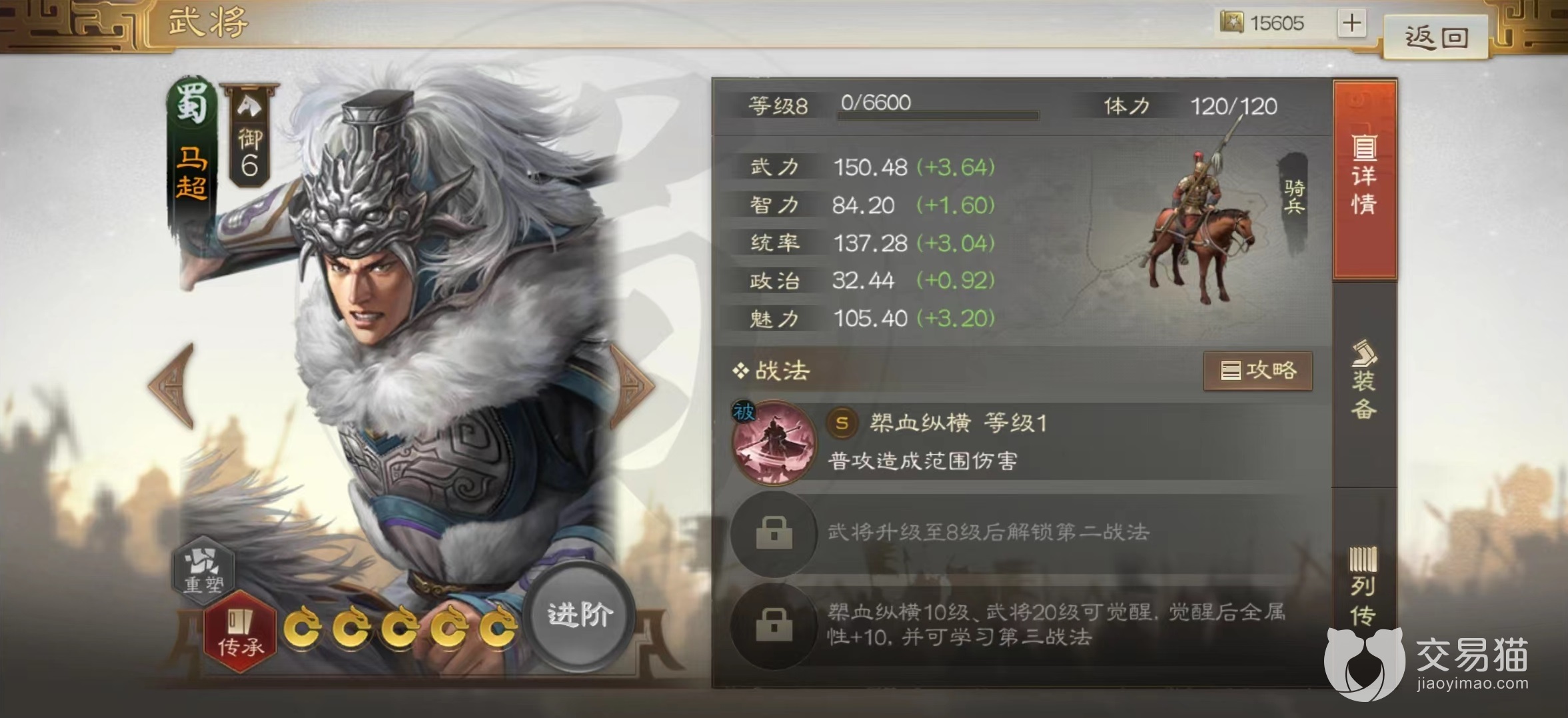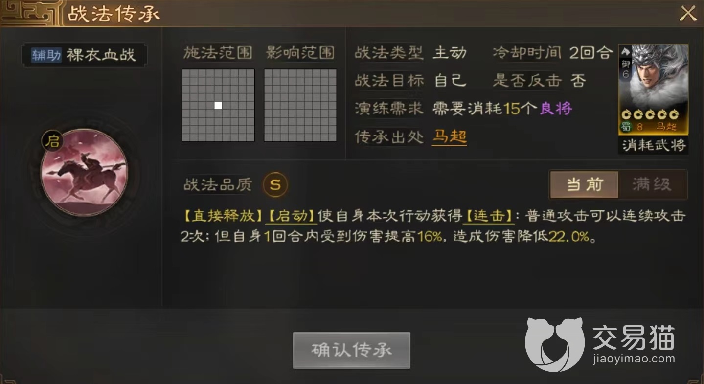 如果是平民玩家玩这套阵容,在技能选择上不要追求全橙色,而是一橙一紫搭配模式,这样就有足够资源将所有角色强化一遍。马超搭配的是裸衣血战和秉义直前,这两个技能组合配合上自身的槊血纵横,已经能将近战输出优势最大程度发挥出来,无需再氪金去继续培养。