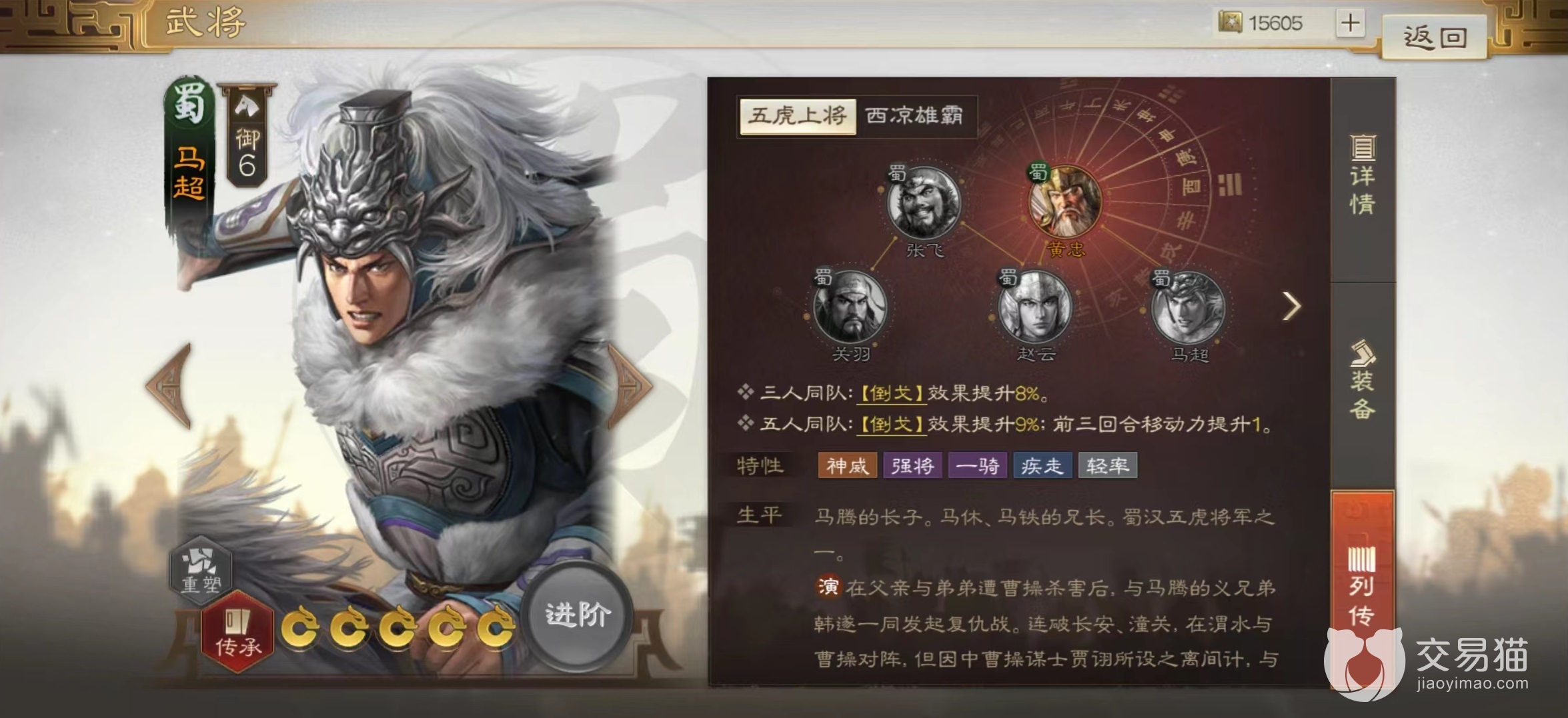 该角色阵容搭配还是非常丰富的,因为有前期和后期两个不同分类,在武将选择上差距很大。因为在前期作为开荒武将,为了将资源更好集中起来,自然在其他队友上就要作出牺牲,采用的是四保一模式,另外四人分别为关平,夏侯霸,沙摩柯与周仓。组成的是纯兵刃输出阵容。在这一套中,马超利用自身战法不断打出高输出,沙摩柯承担先手攻击任务,因为可以降低对方属性强化输出。夏侯霸和关平都是紫色武将中输出比较高的角色,承担补伤害的任务。在战法上不需要太强力的选择,只要符合要求就能用,紫色和部分蓝色组合就可以。