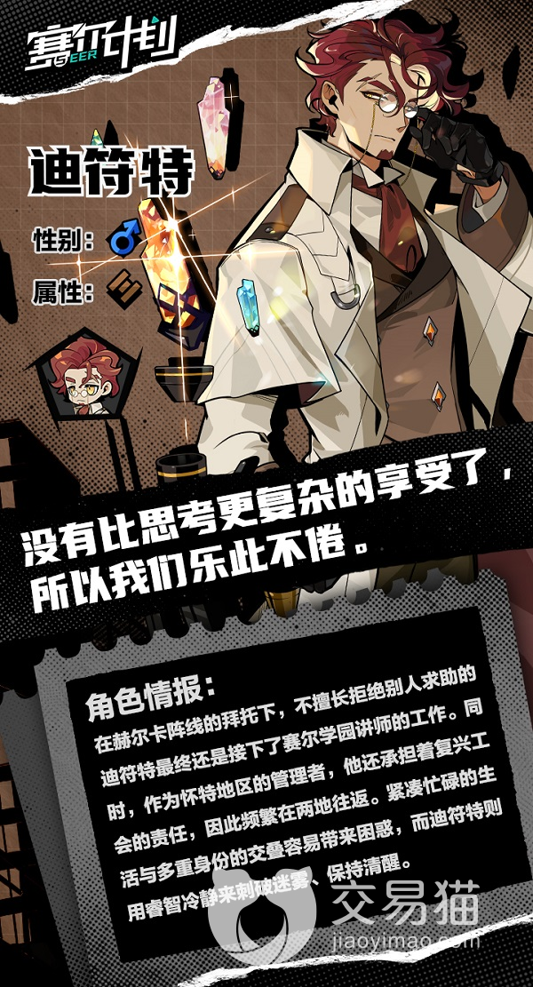 迪符特目前担任着赛尔学园教师的工作,在形象的塑造上也更加偏向斯文的教师,主要职责就是复兴整个工会,因此常常需要在各处来访,平时的生活十分紧凑,拥有很强的责任心,经常会帮助主角们解决困难。