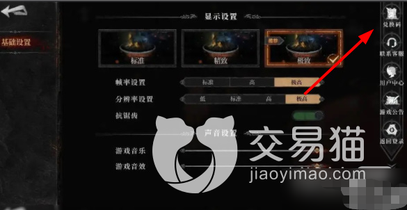 在设置界面中,右上角有一个“兑换码”的按钮,点击进入兑换码兑换界面。