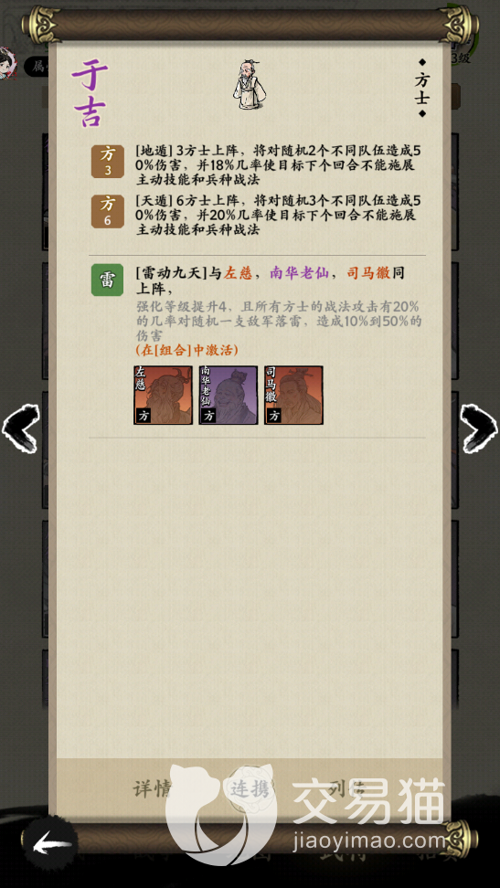 要是大家使用的话于吉的强度肯定是不能当做主要输出来使用的,要是大家想在发挥出于吉的最大强度,其实组成雷动九天的阵容,产生的组合效果是最强的,跟左慈、南华老仙还有司马徽就可以组成这个阵容啦。