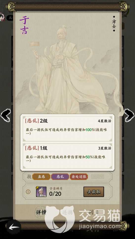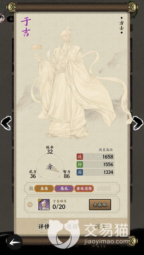 于吉是稀世当中的一个紫将,他也是属于方士定位的角色,统率低到之后32点,武力值也低到只有36点,相比前面来两项,智力的数值有86点是这三点基础属性当中最高的,一技能是蛊惑,在于吉受到攻击的时候有35%的几率可以让对面发起攻击的人进入到混乱的状态中,持续一回合。