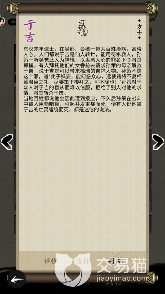 前面给大家介绍的那个武将叫做于禁,很多玩家将于禁跟于吉弄混了,其实于禁是没有于吉厉害的,本期的名将之弈于吉怎么样相关资讯中大家就可以看到,于吉的一些信息,从品质上面于吉就要高一些,毕竟于禁是一个蓝色武将,但是于吉是一个紫色武将,大家一起来看看于吉的强度是什么样的吧。