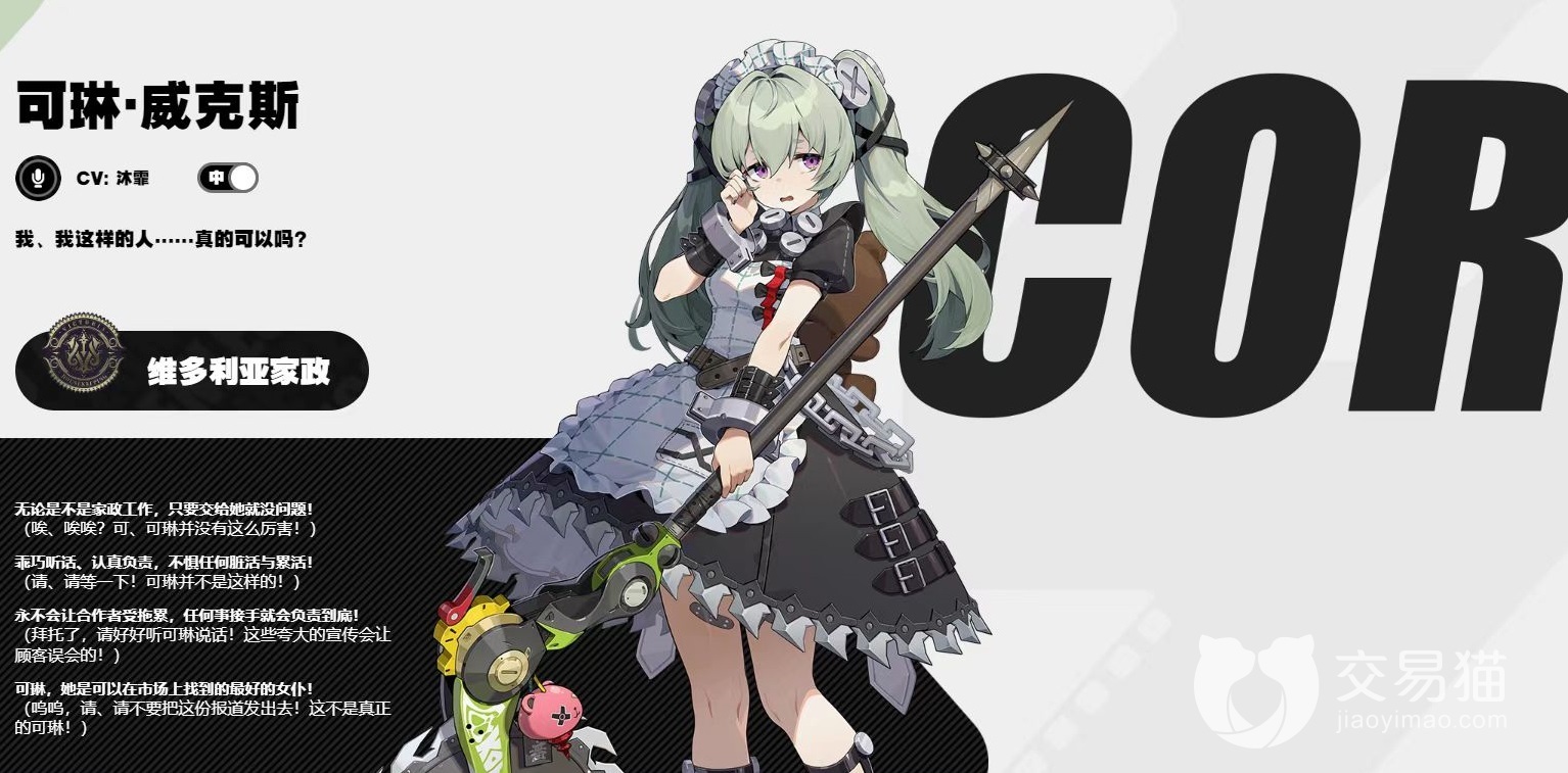 在平常时候,可琳手中武器仅仅是用于清扫的工具,毕竟作为维多利亚家政角色,一身女仆打扮很难让人将其与战斗中狂暴样子联系起来。但是一进入战斗中就将会变成非常夸张的电锯,锯片旋转起来之后如同燃烧流星一般,挥舞的过程中产生很炫酷效果。在属性上也能满足作战需要,除了普攻能打出最多5次连击之外,无论是特殊技或是强化特殊技,都能以长按方式向单体目标连续不断打出斩击,在连续斩击期间,自身受到伤害大幅降低,抗打断能力也获得提升。