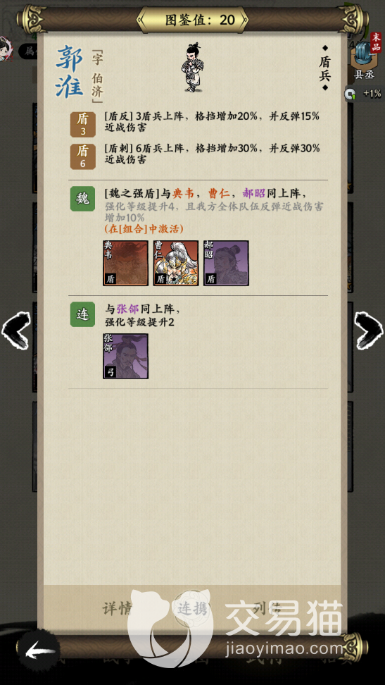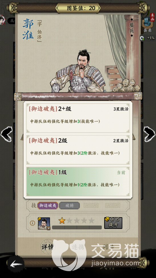 郭淮是名将品质的一个盾兵,统率有84、武力78、智力82,蓝色的武将一般是两个技能,郭淮也不例外,一技能是御边破夷,这个技能在游戏中其实是可以帮助中排队伍的,他们的强化等级会增加一级,要是这个技能等级提升,强化的等级也会跟着提升,最高可以提升3级。
