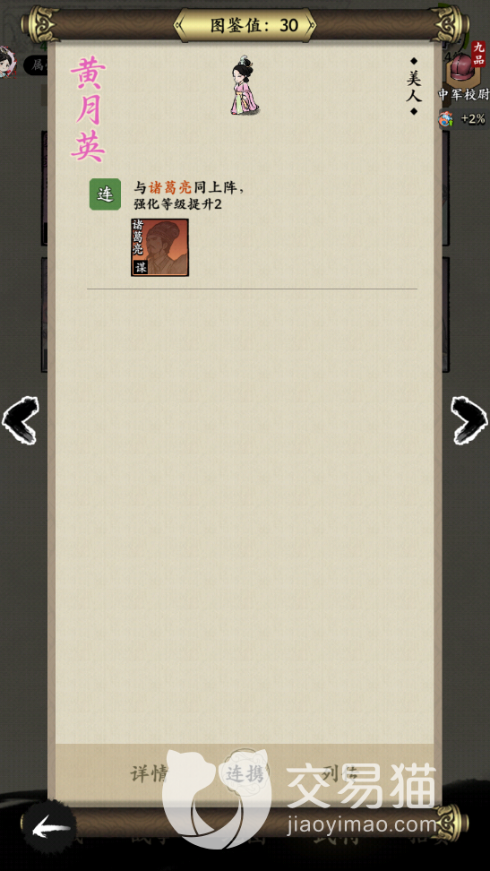 但是因为不占上阵位,所以这个角色没有什么阵容可以组成,但是游戏中有可以跟黄月英产生连携效果的武将,那就是诸葛亮,两人同时在场上的话,就会有2级的等级强化提升效果触发哦。