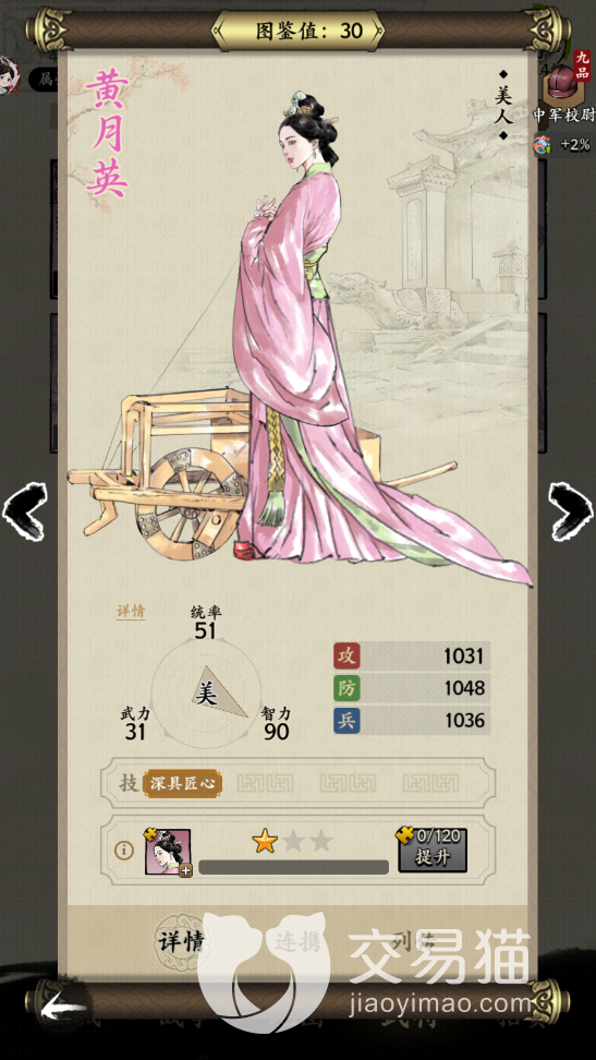 黄月英的属性最高的要属智力,她的智力有90点,不愧是诸葛亮的妻子,统率也有51点,武力值上面只有31点,但是作为一个辅助类型的角色大家对武力也不能有要多的要求,她也只有一个技能,这个技能叫做深具匠心。