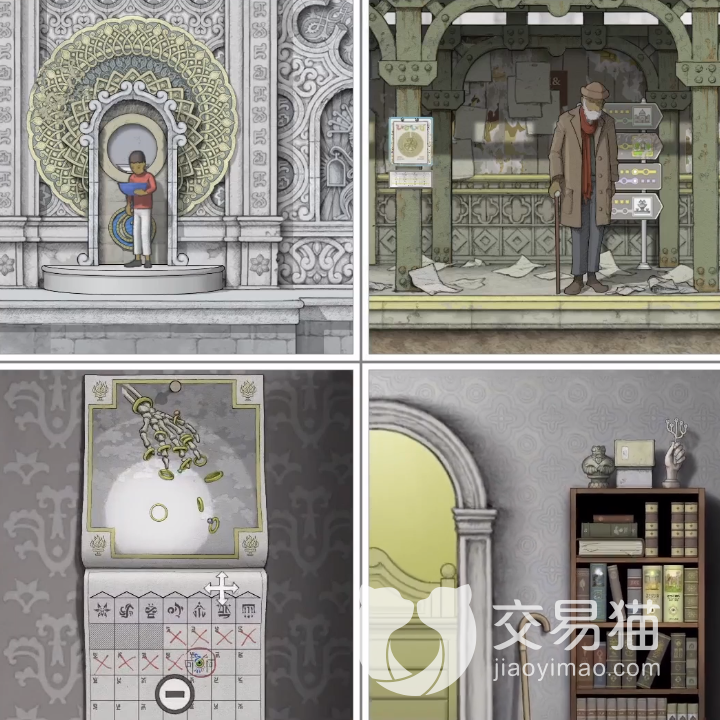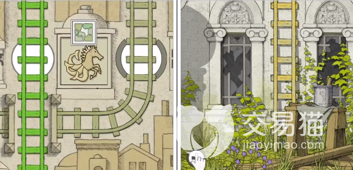 首先主角来到老年时期曾经到访过的巴士站,利用挂历做出硬币乘坐巴士,然后修改巴士路线。先点击放大灰色轨道,可以看到有半侧绿色轨道贴合在屏幕右方,暗示着玩家可以在右边拼接轨道。另一半绿色轨道在教堂外墙最左边的墙壁上,玩家点击放大,将两者上下合并即可完成。