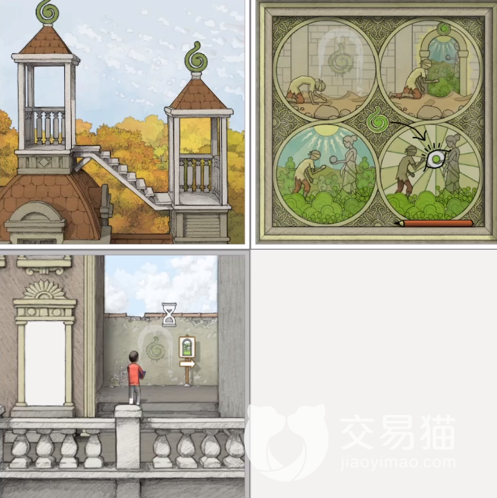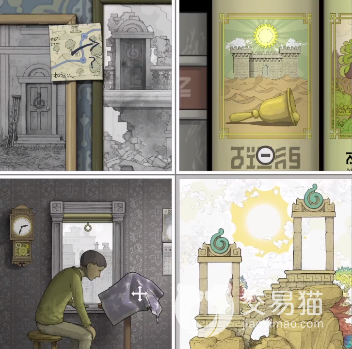 第1个需要旋转的图案在桌布下摇铃里面,点击放大摇铃,看到主角手持摇铃拄着拐杖,行走在沙漠中,然后返回第2张图片将其放在第4格,将两张图片合并一起,玩家可以看到主角所在的沙漠场景扩大了,最后缩小第2张图片的挂画,将半个太阳与底下的图片相接,主角走路就能转动挂画图片,等白色图案停在西侧,就放大取下楼梯。后面几个轮子的转动方式大体相似,玩家重复尝试几次即可通往古建筑最末尾的楼梯拿到蓝色果实。