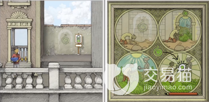 主角拿到红色果实之后退出挂画点击隔壁另一张挂画,玩家可以看到画上有绿色果实标志,4张连环画暗示着玩家这一关通关流程,简单来说就是找到壁上的门,进入女神庭院拿到神像手中的绿苹果。