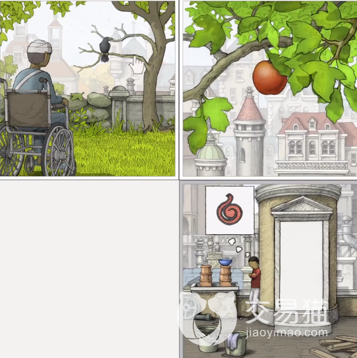 红色果实这一关主要以剧情引导为主,大部分可行走的路程都有红色果实图标指引玩家点击,需要注意的是花园里面摆放图片的顺序,图片顺序反了就拼不成同一张互动图。具体摆放顺序是:老人与乌鸦图片放在第1格,枝头红苹果放在第2格,盘子与小男孩放在第4格,第3格不放置图片。