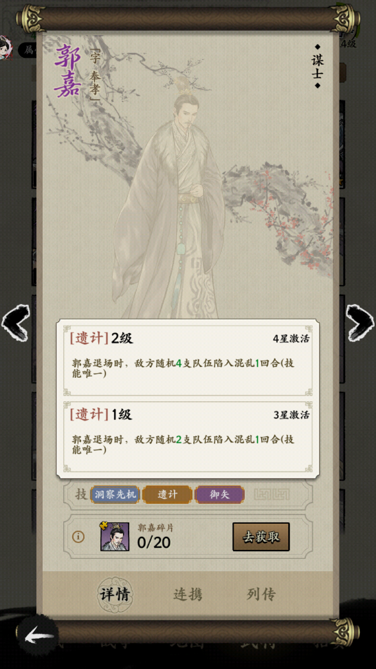 这个技能可以让攻击的目标防御减少15%,而且这个效果可以叠加在一个角色身上3次,减少的防御要是后续的攻击跟上的话,基本就留不了几轮了。二技能是遗计,这个技能是郭嘉退场的时候,最后一个附加效果,可以让地方随机的两只队伍都陷入混乱的状态中。