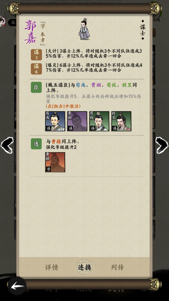 最后一个技能就是御矢,这个技能可以为郭嘉带来所受远程伤害减少25%的效果,也算是一个防御技能,可以帮互郭嘉生存。要是郭嘉跟荀彧、贾诩、荀攸还有程昱一起上场的话,就可以组成魏五谋臣的阵容,可以带来兵种战法增加15%伤害的效果哦。