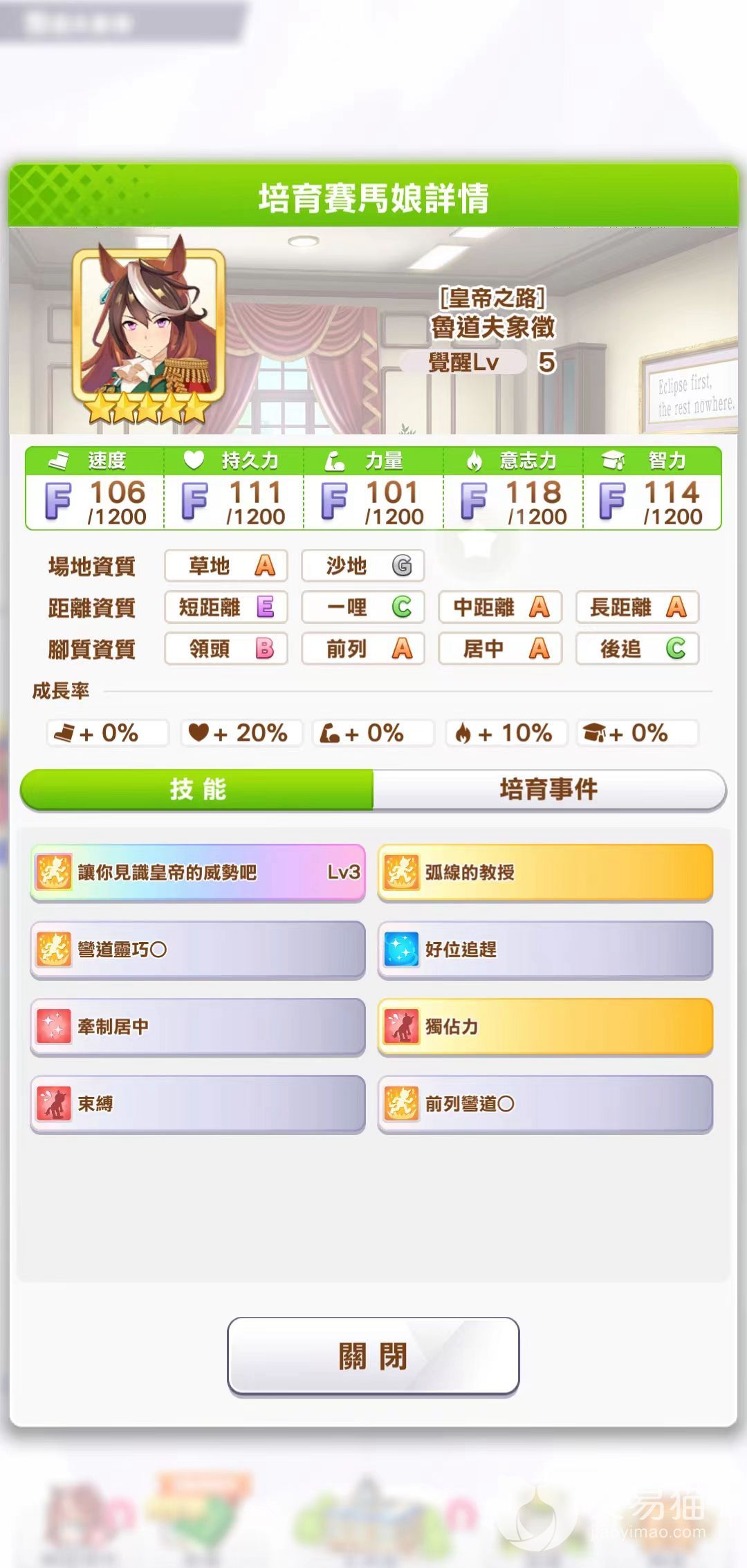 鲁道夫象征的觉醒技能对竞赛影响不大,独占力在后追以外的作战都很难发动,弧线的专家可以透过支援卡片学习,而且觉醒到Lv5消耗的道具太多了。所以不需要提升觉醒Lv也可以顺利完成培育。