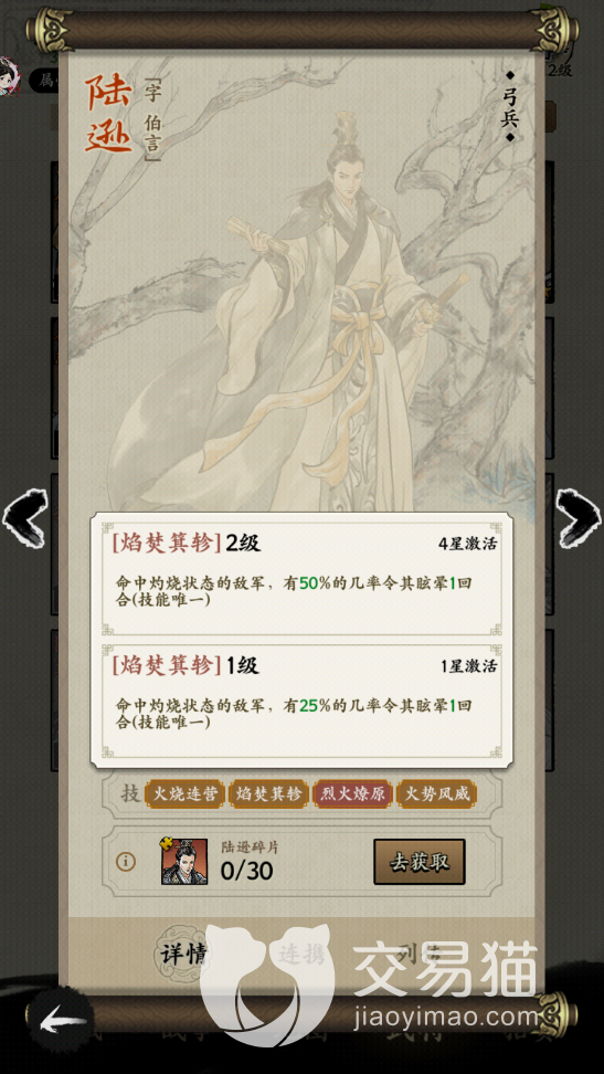 焰焚箕轸是陆逊的二技能,使用的时候可以命中对面烧灼状态的敌军,25%的几率可以让对面的敌人进入眩晕的状态。三技能是烈火燎原,这个技能只有在陆逊三星的时候才可以激活,激活之后就可以给己方带来的灼烧伤害增加100%。