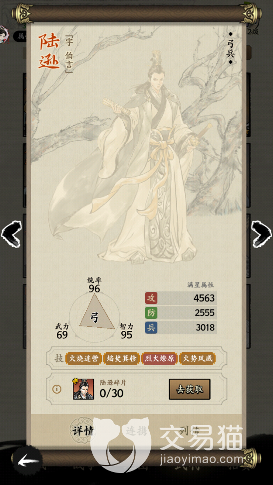 因为陆轩在这里是被设置成为了一个弓兵,所以大家一般可以把陆逊放在后排一点的位置,他作为一个橙色绝品武将,属性上面都还可以,武力值69、智力95以及统率96,一技能是火烧连营,这个技能在命中灼烧状态的敌人的时候,有60%的几率可以让相邻的目标也进入灼烧一个回合,只有两次触发机会。