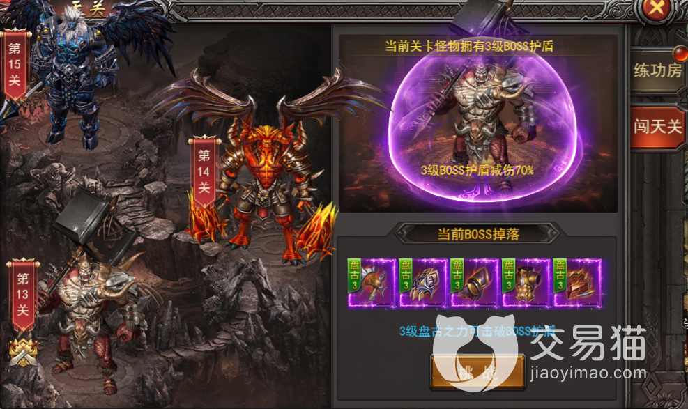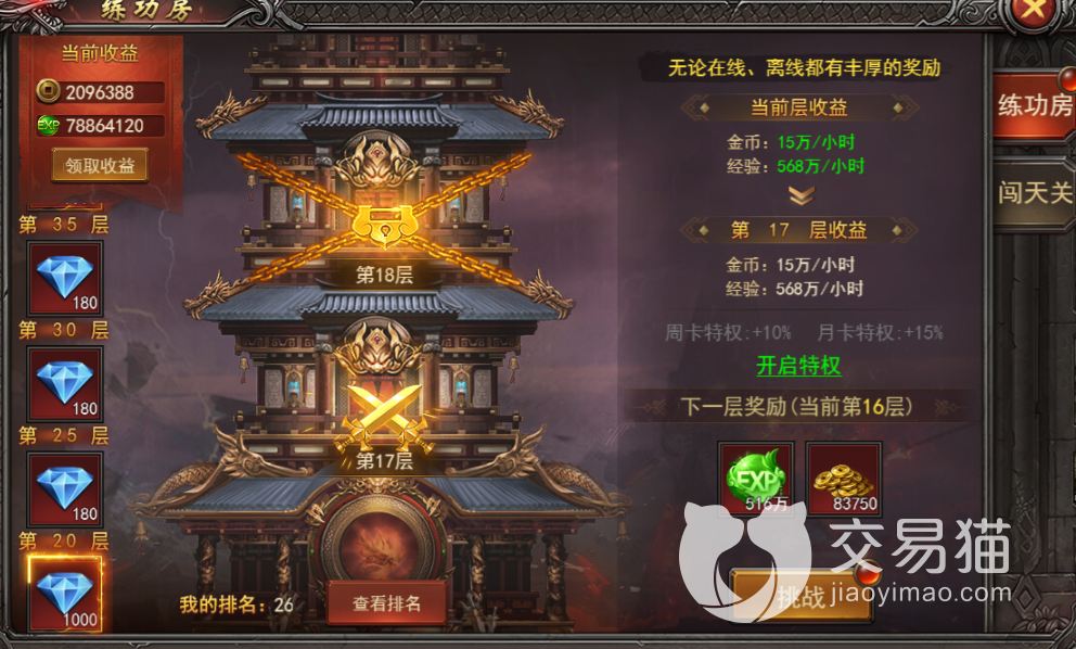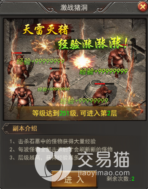 最后一个则是闯天关,他跟猪洞的模式大不相同,这个模式则是提供经验装备,玩家通过副本可以获得经验装备碎片,足量的经验装备碎片可以合成经验装备,升级效率大大提升!